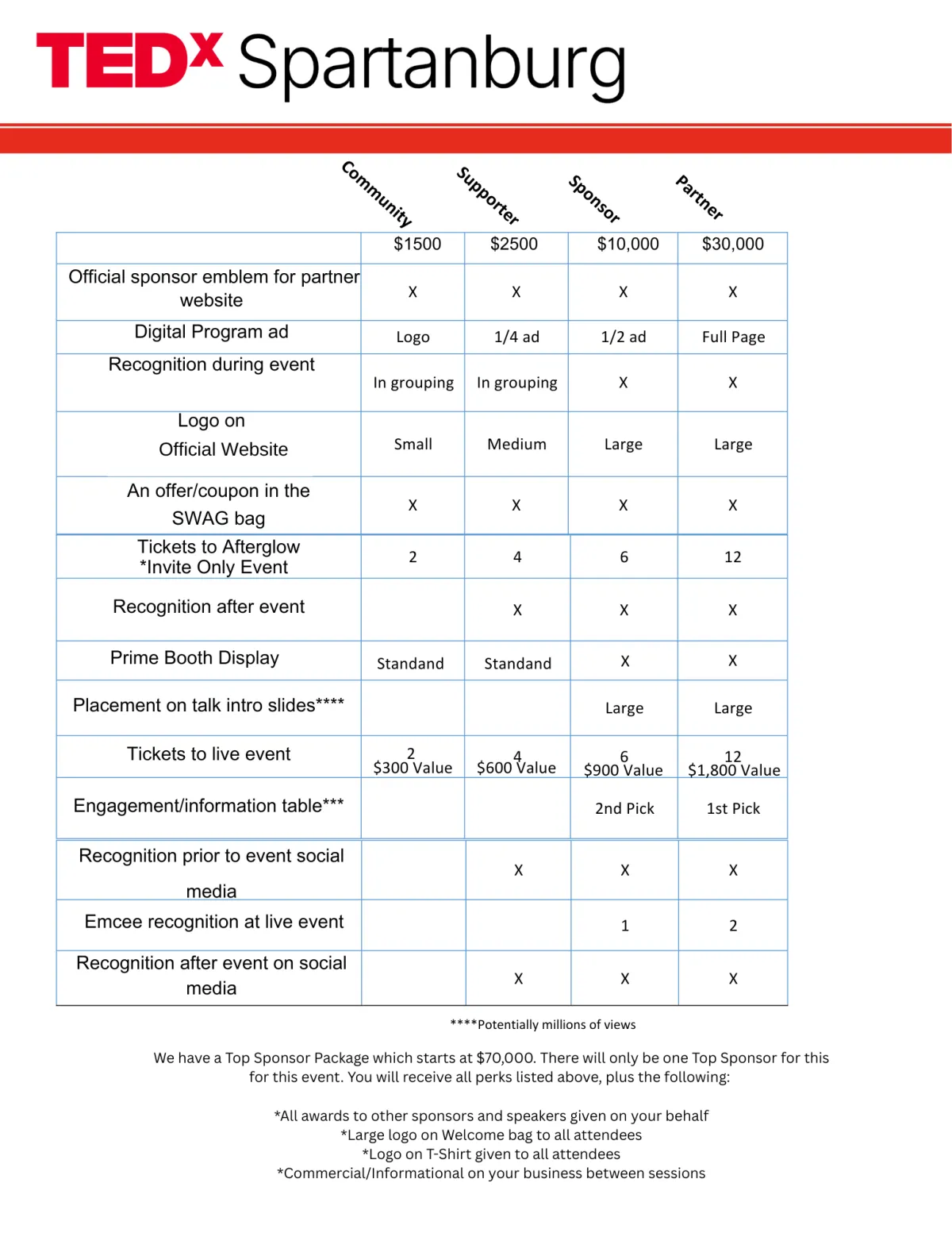 Please complete this form if you are interested in sponsorship opportunities for TEDXSpartanburg. A member of our team will respond with in 24-48 business hours.